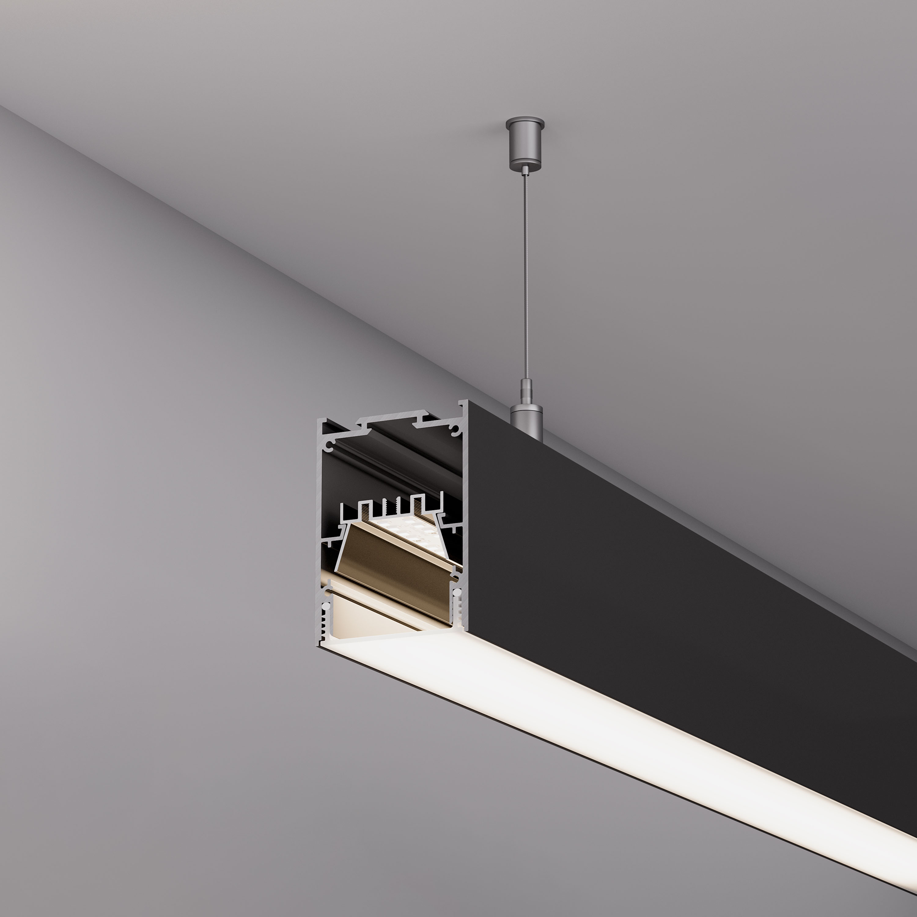Подвесной профиль из алюминия черного цвета для основного освещения с возможностью герметизации до IP54 с помощью аксессуаров к профилю без дополнительного использования силиконового герметика, до IP65 с помощью аксессуаров к профилю при условии дополнительного использования силиконового герметика. Габаритные размеры профиля составляют 2000 мм в длину, 54,25 мм в ширину и 75 мм в высоту. Площадка для установки светодиодных лент позволяет использовать ленту шириной до 16 мм и мощностью до 36 Вт/м. Это обеспечивает гибкость в выборе светодиодных лент и позволяет создать потрясающие световые решения. Экран, заглушки и другие аксессуары не включены в комплект и приобретаются отдельно. Цена указана за 1 метр профиля. Отличное решение для создания современных световых проектов.